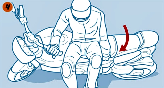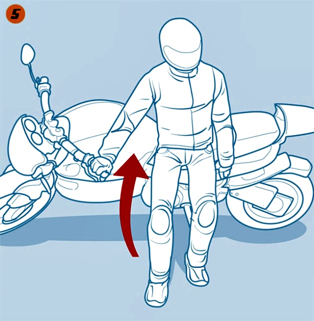 ย่อตัว แล้วเอื้อมมือขวาไปจับปลอกแฮนด์ด้านใกล้พื้นกรณีล้มฝั่งซ้าย ถ้าอีกฝั่งก็เปลี่ยนเป็นมือซ้ายจับปลอกแฮนด์ด้านใกล้พื้น