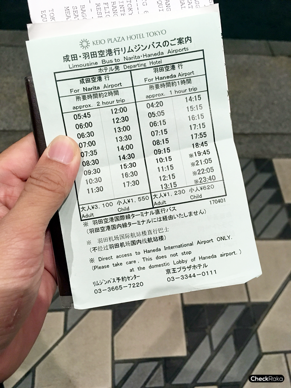 ตารางรถบัส ที่ออกเดินทางจากโรงแรมที่พักไปยังสนามบิน มีให้เลือกทั้งสนามบินนาริตะ และ สนามบินฮาเนดะ