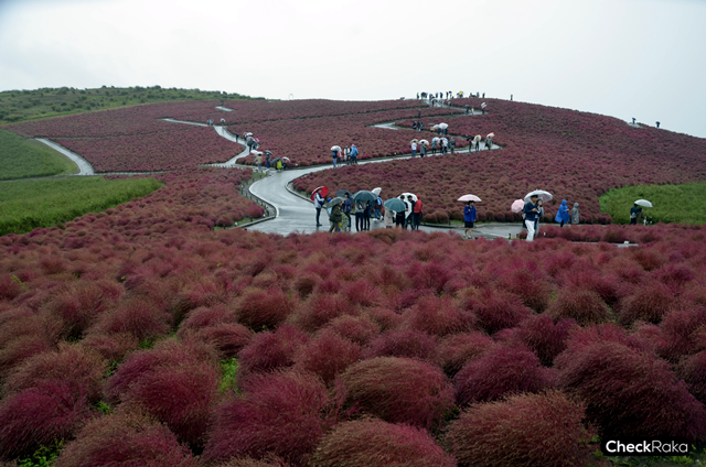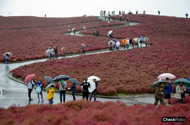 หากใครมาเยือนเมืองฮิตาชินากะ จังหวัดอิบารากิ ต้องไม่พลาดมาชมความสวยงามของสวนดอกไม้ขนาดใหญ่ ที่มีพื้นที่ครอบคลุม 1.9 ล้าน ตร.ม. ที่ภายในจะได้จัดแบ่งพื้นที่ออกเป็นส่วนต่างๆ ตามชนิดและสายพันธ์ุ ที่จะผลัดเปลี่ยนกันบานตลอดทั้งปี โดยเฉพาะอย่างยิ่งในช่วงเดือนกันยายน-ตุลาคม จะเป็นฤดูของต้นโคเชีย (Kochia) หรือต้นไซปรัสฤดูร้อน ที่จะเปลี่ยนเป็นสีแดงตัดกับสีฟ้าอันสดใส (ตามที่ไกด์บอก) แต่ความจริงที่เราได้เจอก็คือท้องฟ้าไม่สดใส เพราะด้วยอิทธิพลของพายุ ทำให้ฟ้าในวันนี้ของสวยฮิตาชิ ซีไซต์ มีแต่เมฆฝน และลมกรรโชก เป็นช่วงๆ จากเดิมที่อากาศค่อนข้างเย็นๆ กลับกลายเป็นหนาวมากๆ หลังจากที่ร่มโดนแรงลมทำร้ายจนเสียหาย เรียกว่ากว่าจะเดินไป-กลับจุดชมวิวนั้นเปียกตั้งแต่หัวจรดเท้า แต่ก็ถือว่าคุ้มค่ากับการเดินไปชมบรรยากาศของต้นโคเชียจริงๆ