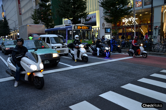 ภาพรถจักรยานยนต์ต่อท้ายรถยนต์ในบริเวณไฟแดงไม่แทรกไปตามช่องต่างๆ ที่พบเห็นได้บ่อยครั้งในญี่ปุ่น