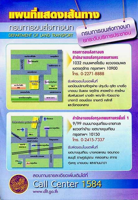 - ต่างจังหวัด ติดต่อได้ที่ สำนักงานขนส่งส่วนภูมิภาคของแต่ละจังหวัด