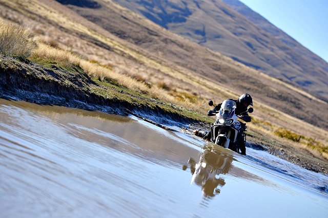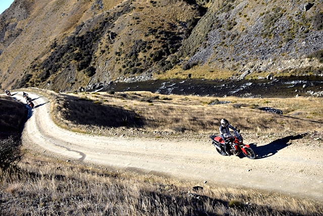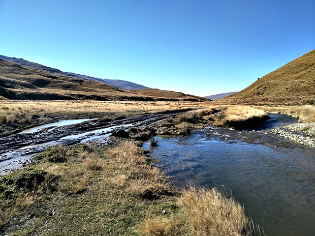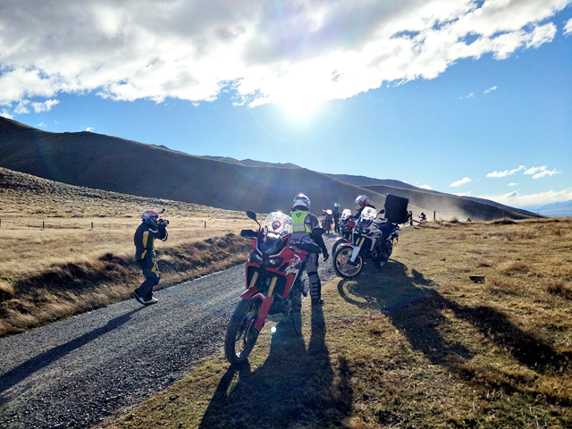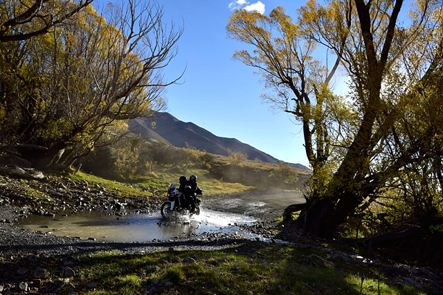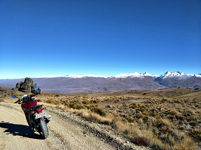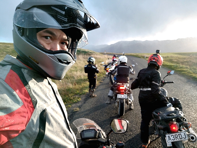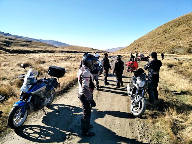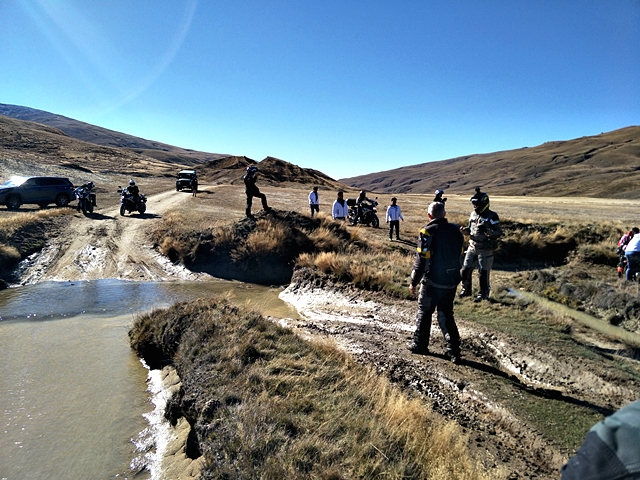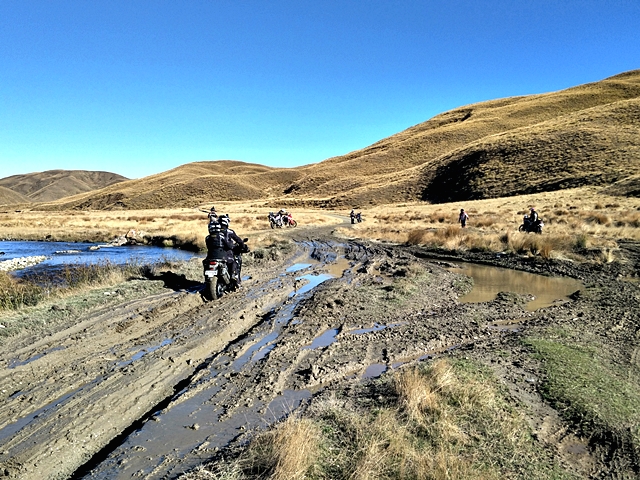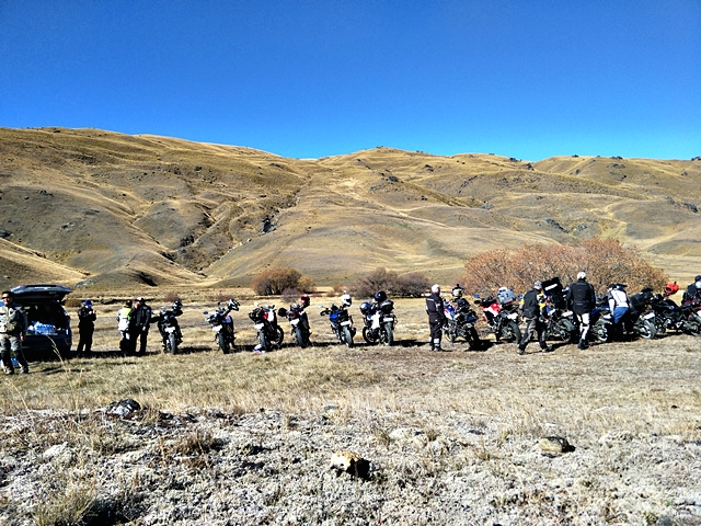 จาก Omarama เราขี่ฟันฝ่าอากาศหนาวมาตลอดช่วงเช้า ตอนออกมาดูอุณหภูมิ -1 องศาเซลเซียส ขบวนมุ่งหน้าไปเติมน้ำมันที่เมือง Cromwell เส้นทางออนโรด 90 กว่า กม. แต่สาหัสกับความเย็นที่ทำเอามือแข็งไปตามๆ กัน แม้แต่ความร้อนของเครื่องยนต์ก็แทบไม่ได้ช่วยอะไร ผู้เขียนที่ใช้ถุงมือแบบวินเตอร์และมีฮีทกริ๊ปก็ยังรู้สึกสะท้านกับอากาศไม่น้อย วันนี้ไฮไลท์อยู่ที่ Nevis road เส้นทางออฟโรดกรวดลอย ทางชันขึ้น-ลงมีอยู่เกือบตลอด มีธารน้ำที่มาจากหิมะละลายไหลผ่านเป็นช่วงๆ แต่ละจุดนี่ลึกและยาวกว่าอุปสรรคที่ Hakataramea Valley Road จากความกลัวกลายเป็นความเคยชิน ขบวนฯ ผ่านไปครึ่งทางด้วยดี เราแวะกินมื้อกลางวันกันแบบง่ายๆ นั่งกินแซนด์วิชที่ทีมงานซื้อเตรียมเอาไว้ รอเผชิญอุปสรรคในช่วงบ่ายที่โหดกว่า