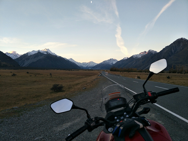 ความสวยงามเบื้องหน้า ทำให้ความเหนื่อยหายไป เป็นความคุ้มค่าของการเดินทางจริงๆ ช่วงสุดท้ายของการเดินทาง เป็นฟรีรันกันแบบไม่ได้นัดหมาย เพราะเป็นถนนทางเดียวสู่ที่พัก ภูเขาหิมะด้านหน้าสวยงามจนแทบไม่อยากกระพริบตา หลายคนต่างหาจุดจอดถ่ายเก็บภาพแห่งความทรงจำกัน สมาชิกทยอยไปเช็คอินที่โรงแรมเดอะเฮอร์มิเทจในช่วงเย็น เราเดินทางกันในวันนี้ทั้งหมด 320.8 กม. ช่วงค่ำเราได้ดื่มด่ำกับบรรยากาศของ Mt.cook ที่รายล้อมด้วยภูเขาหิมะ หลายคนยอมทนหนาวออกมาเก็บภาพทางช้างเผือกในช่วงดึก นี่คือ อีกช่วงเวลาแห่งความทรงจำที่น่าประทับใจของ Riding Passion