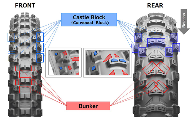 1.Castle Block (บล็อกนูน) พื้นผิว เช่น หินหรือท่อนไม้ที่ฝังอยู่ในดิน และพื้นผิวที่เปียกฝนอาจมีความลื่นมาก คุณสมบัติของ Castle Block เป็นการรวมเอาดอกยางแบบบล็อกเสริมที่ยื่นออกมาจากดอกยางแบบบล็อกทั่วไป ซึ่งดอกยางแบบบล็อกเสริมนี้จะทำให้มีส่วนที่เป็นขอบเพิ่มขึ้นทั้งหมด และเสริมแรงดันบนพื้นผิวลื่นเพื่อการยึดเกาะที่ดียิ่งขึ้น