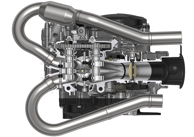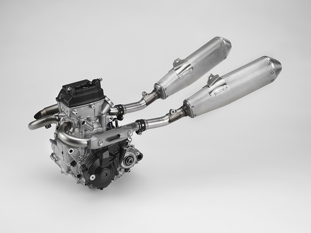 เครื่องยนต์มีมิติ oversquare มากขึ้น และเพิ่มกระบอกสูบ เพิ่มช่องคายไอเสียแบบ Twin exhaust ports หรือมีท่อไอเสียที่ออกจากห้องเผาไหม้ 2 รูนั่นเอง ซึ่งระบบท่อไอเสียนี้ได้รับการออกแบบเพื่อให้มีประสิทธิภาพสูงสุดมีช่องระบายความร้อนคู่ ถังน้ำมันไทเทเนี่ยม โครงสร้างตัวถังอะลูมิเนียมน้ำหนักเบา มอเตอร์สตาร์ทใช้ไฟจาก lithium-iron ความจุน้ำมัน 6.3 ลิตร ความสูง 327 มิลลิเมตร น้ำหนัก 108 กิโลกรัม