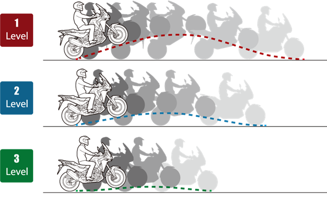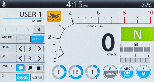 Cornering ABS ส่วนโหมดการขี่ให้เลือกใช้มากถึง 6 โหมด คือ Tour เน้นขี่ทางไกลยาวพร้อมสัมภาระเต็มที่เน้นอัตราเร่ง, Urban เปิดกว้างใช้งานทั่วไปหลากหลาย, Gravel เน้นเซฟตี้และสบายเวลาขี่ทางออฟโรดที่ไม่หนักอย่างทางกรวดทั่วไป, Off-Road ถ้าลุยออฟโรดหนักหน่วงก็ต้องโหมดนี้, User1-2 อันนี้ปรับได้ตามความชอบให้เข้ากับสไตล์ผู้ขี่เป็นได้ 2 แบบ ทั้งหมดคือ การปรับ Power, Engine Braking, ABS, G switch ร่วมกับปรับระบบ HSTC และWheelie control 3 ระดับ ด้านน้ำหนักตัว (เฉพาะรุ่นที่จำหน่ายในไทย) รุ่นธรรมดาเกียร์ MT อยู่ที่ 226 กก. และ