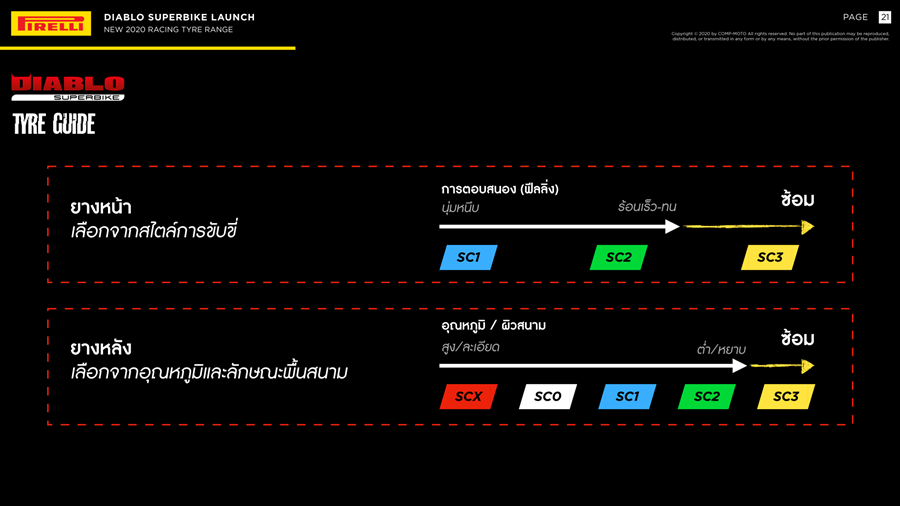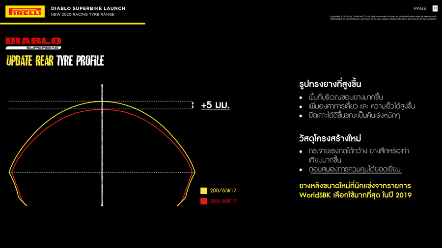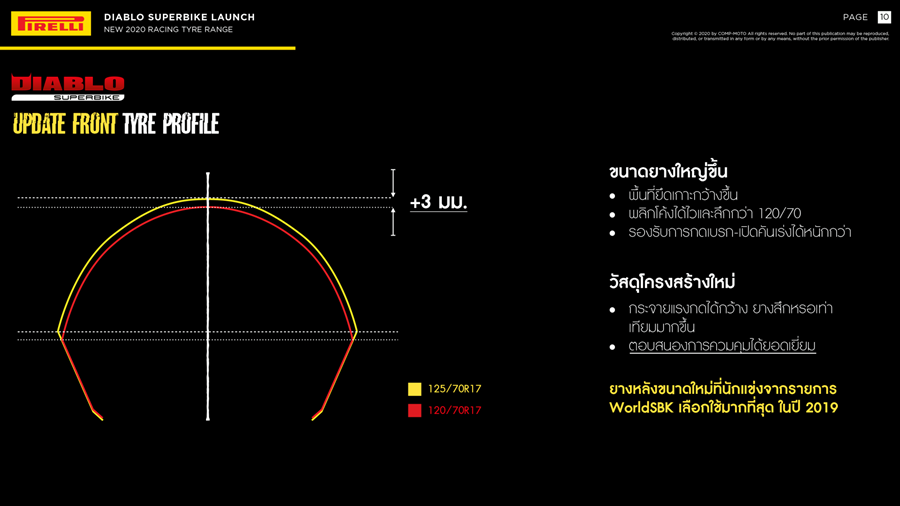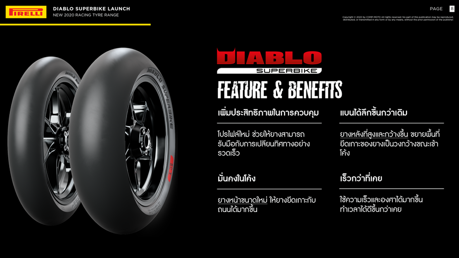 เมื่อ 16 สิงหาคม 2563 ที่ผ่านมา บริษัท คอมพ์โมโต จำกัด ผู้นำเข้ายางบิ๊กไบค์ PIRELLI แต่เพียงผู้เดียวในประเทศไทย นำยางสเปคใหม่จาก WorldSBK มาให้นักแข่งทุกระดับในไทยได้ใช้ยางเซอร์กิตระดับโลก โดยมีการเปิดตัวพร้อมทดสอบที่ บุรีรัมย์ อินเตอร์เนชั่นแนล เซอร์กิต