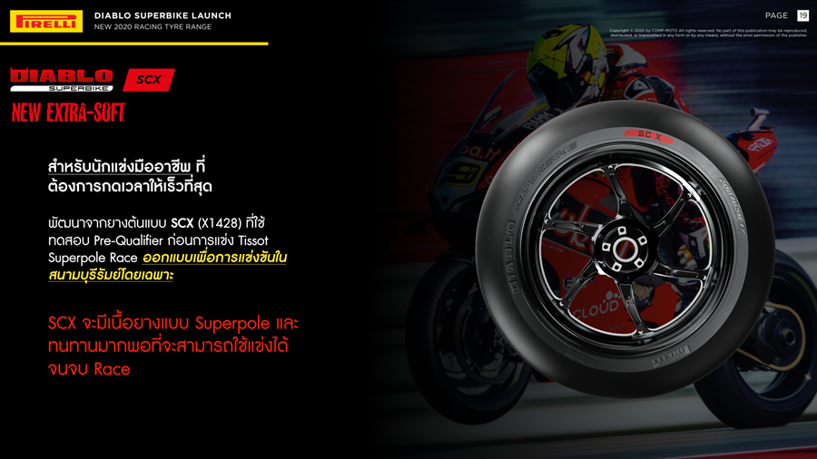ยาง Diablo Superbike SCX ใหม่ที่วางจำหน่ายอย่างเป็นทางการ คือสเปคเดียวกับโปรโตไทป์ X1428 ปี 2019 ออกใช้กับแทร็คอุณหภูมิสูง และพื้นสนามละเอียดอย่าง บุรีรัมย์ อินเตอร์เนชั่นแนล เซอร์กิต โดยเนื้อยางของ Diablo Superbike SCX จะเป็นยาง Extra Soft ใกล้เคียงกับยาง Superpole® แต่เสริมโครงสร้างและพัฒนาให้ยางสามารถใช้แข่งได้จนจบต่างจากยาง Superpole® ที่ใช้ได้ไม่เกิน 2 รอบ