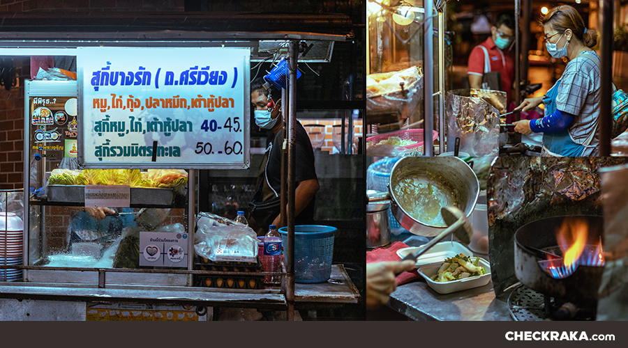 หากใครชอบทานผัก ดึกๆ ไม่เน้นหนัก และชอบกินอาหารจานเดียว อีก 1 ร้านที่อยากแนะนำ คือ สุกี้บางรัก (ถ.ศรีเวียง) ที่ปักหมุดอยู่ตรงข้าม ทางเข้าโรงแรม แชงการีล่าร้านอยู่หัวมุมถนน สั่งสุกี้แห้ง มาทานความหอมจากการผัด และผักสดที่ผักคลุกเคล้ากันแบบพอดี ไม่เละ หมูนุ่มเด้ง บวกกับน้ำจิ้มรสเด็ดที่ราด ผ่านสุกี้ร้อนๆ ความหวานอมเปรี้ยวนิดๆ ของน้ำจิ้มที่ซึมผ่าน คลุกเคล้ากับสุกี้ที่ผัดร้อนๆ จากกระทะ กลิ่นหอมจดอดไม่ได้ ขอนั่งฟิน กินบนเจ้ากรอมน้อย ให้สาแก่ใจ แถมราคาก็แสนจะสบายกระเป๋า 40-60 บาท ใครอยากลอง ไปหลัง 5 โมงเย็น นะจ๊ะ จะไปแบบซื้อกลับ หรือนั่งที่ร้าน ก็มีโต๊ะให้นั่ง แต่ก็เว้นระยะกันด้วยน่า