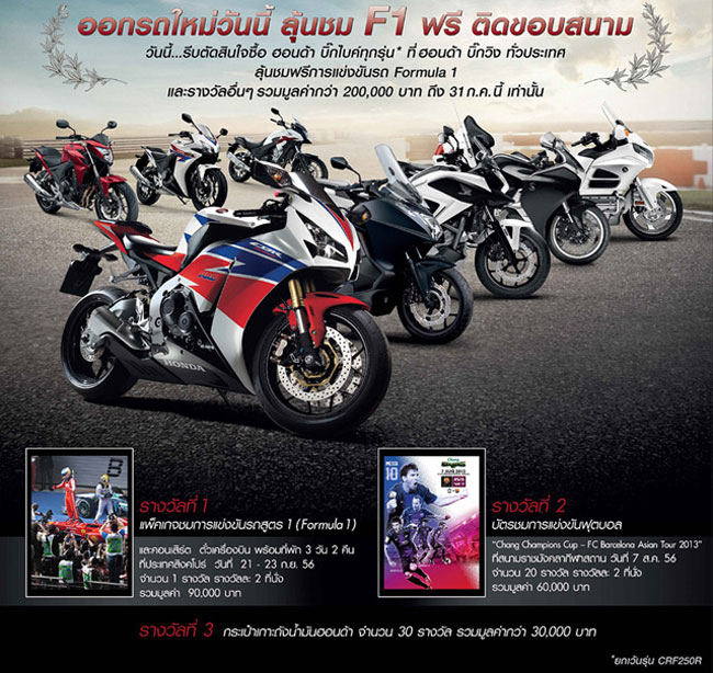 "นอกจากการทำโรดโชว์แล้ว ฮอนด้าบิ๊กวิงยังได้จัดแคมเปญพิเศษสุดสำหรับลูกค้าที่สนใจฮอนด้าบิ๊กไบค์นำเข้าทุกรุ่น ด้วยอัตราดอกเบี้ยต่ำสุด 0% หรือเลือกรับฟรีประกันภัยชั้น 1 ในกรณีชำระด้วยเงินสด ถือเป็นข้อเสนอพิเศษเพื่อให้ลูกค้าตัดสินใจง่ายขึ้น พร้อมกันนี้ ลูกค้าที่ออกรถใหม่กับเราภายใน 31 กรกฏาคม 2556 ยังจะได้ลุ้นแพคเกจชมการแข่งขันรถ Formula 1 ที่ประเทศสิงค์โปร์ เป็นเวลา 3 วัน 2 คืน จำนวน 2 ที่นั่ง หรือลุ้นรับรางวัลอื่นๆอีกมากมายอาทิ บัตรเข้าชมการแข่งขันฟุตบอลระหว่างบาร์เซโลน่ากับทีมชาติไทยจำนวน 40 ที่นั่ง เป็นต้น"