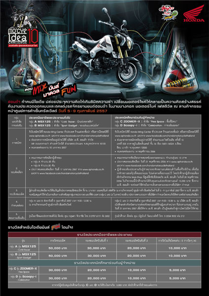 มอไซค์ไอเดียชาลเลนจ์ครั้งที่ 10 ตอน Mix มาดวล Fun ชิงเงินรางวัลรวมทั้งสิ้นกว่า 1 ล้านบาท โดยผู้ที่ผ่านเข้ารอบสุดท้ายในแต่ละรุ่นยังจะได้รับโอกาสเข้าร่วมแสดงผลงานภายในงานบางกอก มอเตอร์ไบค์ เฟสติวัล 2014 อีกด้วย เริ่มเปิดรับสมัครแล้วตั้งแต่วันนี้เป็นต้นไป ขอรับใบสมัครได้ที่ร้าน Honda Wing Center ทั่วประเทศ