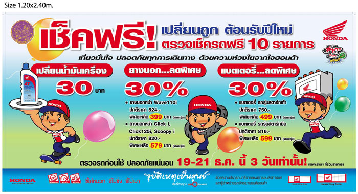 นอกจากการรณรงค์ให้มีการขับขี่อย่างปลอดภัยผ่านโฆษณาชุดใหม่แล้ว เอ.พี.ฮอนด้า ยังได้ร่วมกับเครือข่ายศูนย์จำหน่ายและบริการฮอนด้าวิงเซ็นเตอร์ทั่วประเทศจัดโครงการ Free Service ในช่วงปีใหม่ มอบบริการตรวจเช็คสภาพสำหรบผู้ใช้รถจักรยานยนต์ฮอนด้าฟรีถึง 10 รายการ เปลี่ยนถ่ายน้ำมันเครื่องในราคาพิเศษเพียง 30 บาทเท่านั้น และยังมอบส่วนลดพิเศษอีก 30% สำหรับยางอะไหล่และแบตเตอรี่ ระหว่างวันที่ 19 ถึง 21 ธันวาคม 2556 ตามด้วยการเปิดจุดพักรถพิเศษให้บริการฟรีเครื่องดื่มทั้งร้อนและเย็นรวมถึงของว่าง พร้อมบริการสปานวดเท้า สำหรับผู้ที่เดินทางไกลด้วยรถจักรยานยนต์ฮอนด้าบนเส้นทางหลวงขึ้นสู่ภาคเหนือสายชัยนาทสรรพยา ตั้งแต่วันที่ 27 ธันวาคม 2556 ถึง 2 มกราคม 2557