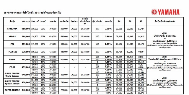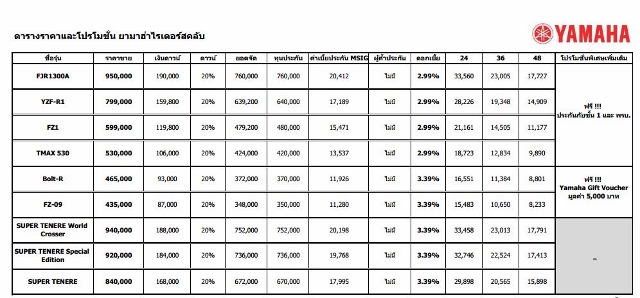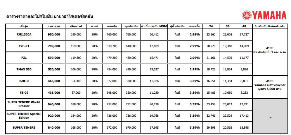 พบกับโปรโมชั่นสุดพิเศษภายในงาน Bangkok International Motor Show 2014 ตั้งแต่วันที่ 26 มี.ค. - 6 เม.ย. 57 นี้เท่านั้น ดอกเบี้ยขั้นต่ำ 2.99% ประกันภัยชั้น 1 พร้อม พรบ. และรับฟรี Yamaha Gift Voucher บัตรเติมน้ำมันสอบถามรายละเอียดเพิ่มเติมได้ที่ Yamaha Riders' Club โทร. 02-276-0222รายละเอียดตารางผ่อนรถจักรยานยนต์ยามาฮ่า บิ๊กไบค์รุ่นต่างๆข่าว-โปรโมชั่นล่าสุดอื่นๆ