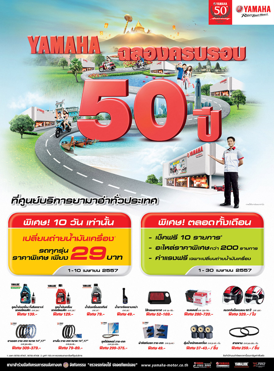 Yamaha ฉลอง 50 ปี เช็คฟรี 10 รายการ ถ่ายน้ำมันเครื่องเพียง 29 บาท