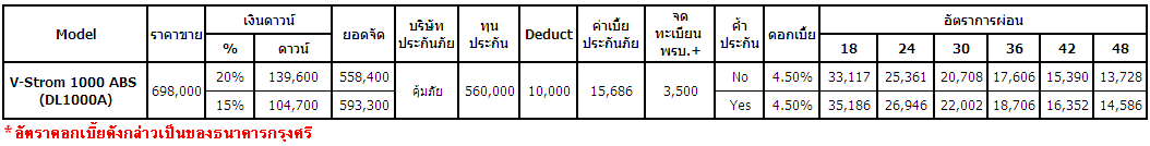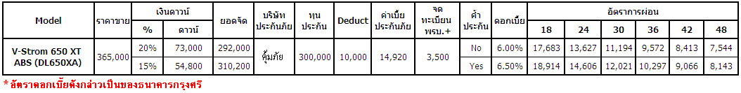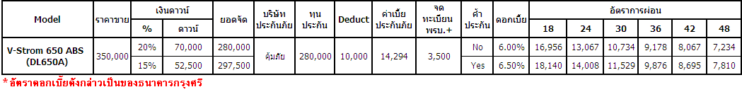 จักรยานยนต์ซูซูกิ บิ๊กไบค์ 6 รุ่น 6 สไตล์ เผยตารางผ่อนและดาวน์บิ๊กไบค์ ซูซูกิ หลากหลายรุ่น สำหรับผู้ชื่นชอบ โดยทุกรุ่นมีข้อเสนอโดนๆ ให้เป็นเจ้าของได้ง่ายๆ ดังนี้Suzuki V-Strom 650XT