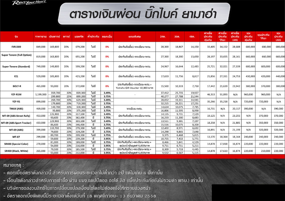 ยามาฮ่า บิ๊กไบค์ รุ่น FJR1300, Super Tenere (Full Option), Super Tenere และ FZ1 ดอกเบี้ย 0% แถมฟรี ทะเบียนพ.ร.บ. ประกันชั้น 1 สำหรับรุ่น Bolt ดอกเบี้ย 0% แถมฟรี ทะเบียน พ.ร.บ. ประกันชั้น 1 แถมเพิ่มคูปองมูลค่า 10,000 บาท แลกของแต่งหรือเสื้อผ้า Yamaha