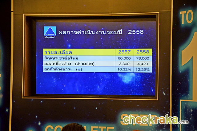 "ความสำเร็จของซัมมิท แคปปิตอล ในรอบปีที่ผ่านมานั้นเป็นผลจาก 3 ปัจจัยหลัก คือ 1. การขยายสาขาในพื้นที่เป้าหมายอย่างต่อเนื่อง ส่งผลให้รายได้เพิ่มสูงขึ้น 2. การเพิ่มบุคลากรให้สอดคล้องกับจำนวนพื้นที่ให้บริการที่มากขึ้น โดยเน้นรับสมัครคนในท้องถิ่น พร้อมสร้างทีมที่แข็งแกร่งด้วยการจัดตั้งแผนกอบรมพนักงานขึ้นใหม่ และ 3. การลงทุนเพื่อสร้างศูนย์บริการสินเชื่อ ซัมมิท แคปปิตอล พร้อมเทคโนโลยีทันสมัยได้มาตรฐานสากล ด้วยงบประมาณสูงถึง 20 ล้านบาท ทำให้เกิดความคล่องตัวในการรับ-ส่งเอกสารจากสาขาทั่วประเทศมายังสำนักงานใหญ่ อนุมัติสินเชื่อได้อย่างรวดเร็ว แม่นยำ ปลอดภัย มีประสิทธิภาพสูง ยังสามารถช่วยคัดกรองกลุ่มลูกค้าที่มีแนวโน้มว่าจะทุจริตเพื่อควบคุมคุณภาพลูกหนี้ ลดหนี้เสียได้อีกด้วย"