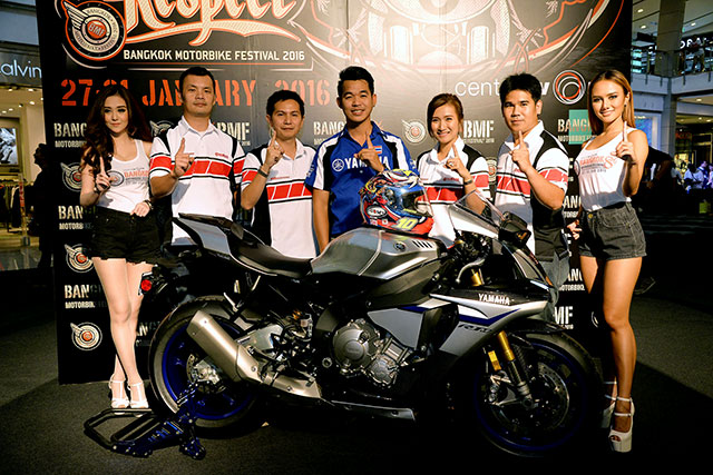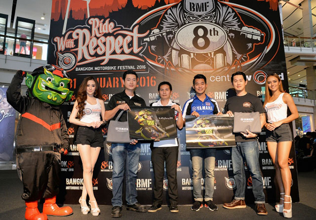 นายวีรพงษ์ ธนากิจจานนท์ (ที่ 3 จากซ้าย) ผู้จัดการส่วน พัฒนาธุรกิจรถนำเข้า บริษัท ไทยยามาฮ่ามอเตอร์ จำกัด ร่วมงานแถลงข่าวเปิดงาน "แบงค์ค็อก มอเตอร์ไบค์ เฟสติวัล 2016" (BMF 2016) เทศกาลมอเตอร์ไซค์ที่ยิ่งใหญ่ที่สุดในเอเชียตะวันออกเฉียงใต้ โดยจะจัดขึ้นระหว่างวันที่ 27-31 มกราคม 2559 ณ ศูนย์การค้าเซ็นทรัลเวิลด์ยามาฮ่า ไรเดอร์ส คลับ เตรียมยกทัพรถจักรยานยนต์ยามาฮ่าบิ๊กไบค์ หลากหลายรุ่น ให้ไบค์เกอร์ชาวไทยได้สัมผัสกันอย่างใกล้ชิดทุกโมเดล ไม่ว่าจะเป็น ตระกูล MT-Series อย่างน้องใหม่มาแรง M-SLAZ, MT-03, MT-07, MT-09, MT-01 ตระกูล R-Series สายพันธุ์แห่งความแรงอย่าง YZF-R1M, สุดยอดรถ Advanture อย่าง FJ-09, รถ Classic สุดเท่ไม่ว่าจะเป็น SR400, Bolt C, Bolt R ต่อด้วยสุดยอดรถ Sport Touring อย่าง FZ-1 กับ FJR1300 และที่ขาดไม่ได้กับชุดแต่ง MT-07 จากสำนักแต่งชั้นนำของยุโรป MT-07 Moto Cage นอกจากนี้ภายในบูธยังมีกิจกรรมอีกมากมาย พร้อมจัดแคมเปญสุดพิเศษที่มีเฉพาะในงานเอาใจคอมอเตอร์ไซค์แบบเต็มที่