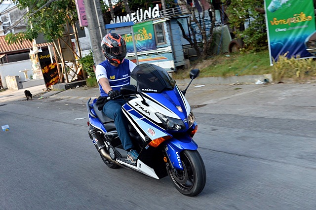 การใช้งาน TMAX ในเมืองนับว่าคล่องตัวไม่น้อย และนั่งขี่สบายกว่ามอเตอร์ไซค์ทั่วไปเยอะ.jpg)