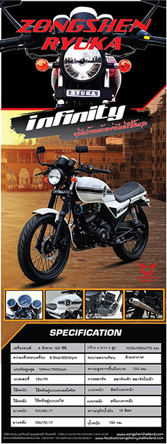 "จอง แชร์ แชะ" กิจกรรมดีๆ ง่ายๆ กับ Zongshen Ryuka Infinity รับรางวัลมูลค่ามากกว่า 5,000 บาท- "จอง" ลูกค้าสามารถจองรถได้ตั้งแต่วันนี้ - 30 มิถุนายน 2559 ที่ร้านผู้แทนจำหน่ายทั่วประเทศ เพียงแค่นี้ ท่านก็ได้รับสิทธิ์เป็นเจ้าของเสื้อแจ็คเก็ตหนังและหมวกนิรภัย รุ่น Limited Edition