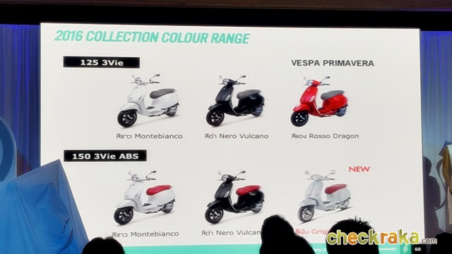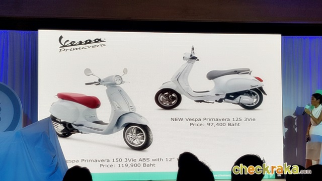 - Vespa Primavera 150 3Vie ABS ราคา 119,900 บาท มี 3 เฉดสี ได้แก่ สีขาว (Montebianco) สีดำ (Nero Vulcano) และสีใหม่คือสีเงิน (Grigio Seta)