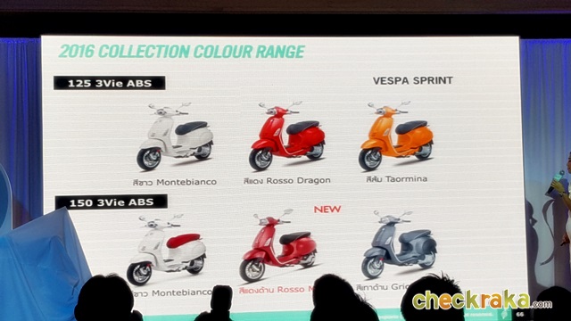 - Vespa Sprint 150 3Vie ABS Matt Series ราคา 125,900 บาท มี 2 เฉดสี ได้แก่ สีเทาด้าน (Grigio Titanio) และสีใหม่คือสีแดงด้าน (Rosso Matt)