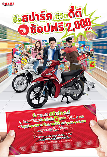 - - ลูกค้าที่ซื้อรถจักรยานยนต์ยามาฮ่าสปาร์ค ทุกรุ่นระหว่างวันที่ 1 กันยายน ถึง 30 พฤจิกายน 2559 รับทันทีบัตรกำนัลบิ๊กซี มูลค่า 2,000 บาท พร้อมรับบัตรยามาฮ่าสมาร์ทแคร์ เปลี่ยนถ่ายน้ำมันเครื่องพร้อมไส้กรองน้ำมันเครื่องฟรี! 2 ปี หรือ 20,000 กิโลเมตร รวม 20 รายการ มูลค่า 4,222 บาท รวมมูลค่าทั้งสิ้น 6,222 บาท