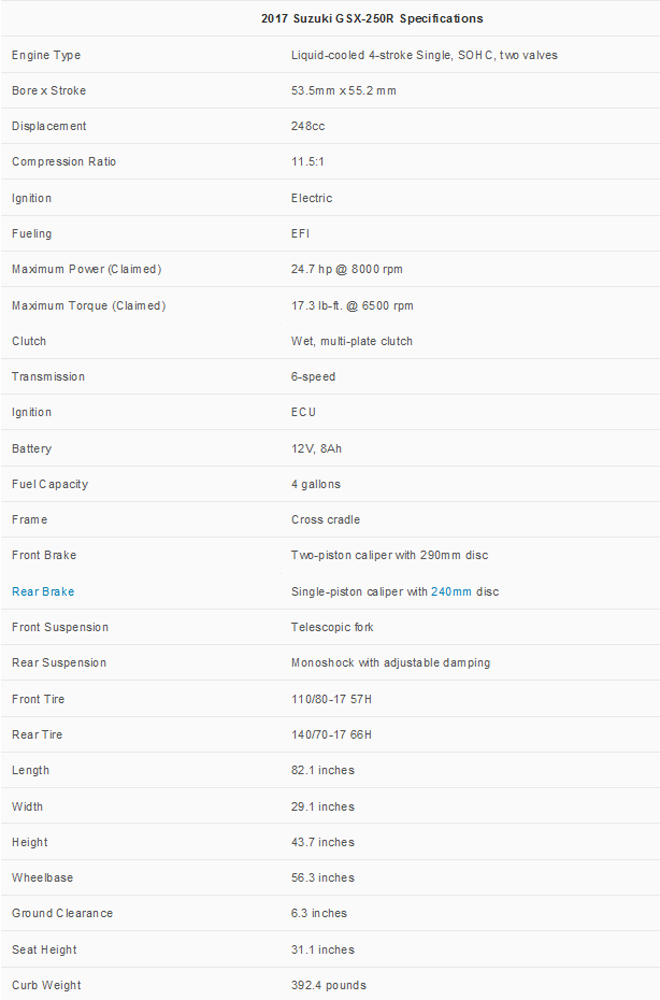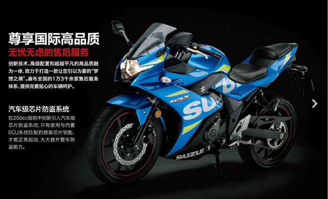 ซูซูกิและพาร์ทเนอร์จากจีน Haojue เผยสปอร์ตไบค์คันใหม่ GSX-250R ในงาน Chinese International Motorcycle Trade Exhibition (CIMAMotor) ปี 2016GSX-250R ใช้ขุมพลังขนาด 248 ซีซี SOHC Single เหมือนกับ GW250 อัตราส่วนกำลังอัดเท่าเดิม แต่ซูซูกิเคลมว่า สเปคมี 24.7 แรงม้าที่ 8,000 รอบต่อนาที และแรงบิด 17.3 ปอนด์/ฟุต ที่ 6,500 รอบต่อนาที น้ำหนักอยู่ที่ 178 กิโลกรัม ลดลงจากรุ่น GW250 ราว 5 กิโลกรัมระบบกันสะเทือนใช้ KYB telescopic fork ขนาด 37 มิลลิเมตร และด้านหลังปรับได้ เบรกใช้ซิงเกิลดิสก์เบรก two-piston Nissin caliper gripping สำหรับล้อหน้า และ single-piston caliper สำหรับล้อหลัง ส่วนดิสก์เบรกใช้ขนาด 290 มิลลเมตรทั้งคู่เครื่องยนต์และระบบการทำงานใช้ร่วมกับ GW250 แต่ดีไซน์จะคล้ายทาง GSX-R สปอร์ตไบค์รุ่นใหญ่ มากกว่า ส่วนฟีเจอร์อื่นๆ มีจอ LCD เบาะนั่งสูง 31.1 นิ้ว เลือกได้ 6 สี ได้แก่ สีน้ำเงินเขียวขาวของ MotoGP, ขาว, ดำ, ดำขอบทองและขาว, แดงดำ และน้ำเงินขาว คาดว่าซูซูกิเวอร์ชั่นนี้เป็นคู่แข่งกับ Yamaha R3 และ KTM RC390