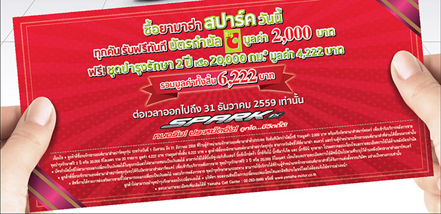 - ลูกค้าที่ซื้อรถจักรยานยนต์ยามาฮ่าสปาร์ค ทุกรุ่นระหว่างวันที่ 1 กันยายน ถึง 31 ธันวาคม 2559 รับทันทีบัตรกำนัลบิ๊กซี มูลค่า 2,000 บาท พร้อมรับบัตรยามาฮ่าสมาร์ทแคร์ เปลี่ยนถ่ายน้ำมันเครื่องพร้อมไส้กรองน้ำมันเครื่องฟรี! 2 ปี หรือ 20,000 กิโลเมตร รวม 20 รายการ มูลค่า 4,222 บาท รวมมูลค่าทั้งสิ้น 6,222 บาท