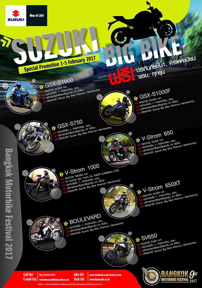 ในปีนี้บูธ SUZUKI BIG BIKE รถจักรยานยนต์ที่ได้รับความนิยมอย่างมากคงหนีไม่พ้น Suzuki GSX-S750 ที่ยอดจองล้นหลาม และอีกหนึ่งรุ่นที่ได้รับความสนใจเช่นกัน Suzuki GSX1300R Hayabusa Yoshimura TX-1 ที่ผลิตเพียง 5 คัน เท่านั้นในประเทศไทย ภายในบูธ SUZUKI BIG BIKE ยังมีรถรุ่นอื่นๆ ที่มาจัดแสดงไม่ว่าจะเป็น Suzuki GSX1300R Hayabusa, Suzuki V-Strom 1000 ABS, Suzuki GSX-S1000, Suzuki GSX-S1000F, Suzuki SV650, Suzuki Burgman 200 ABS และ Suzuki VanVan 200 พร้อมโปรโมชั่นแรงแบบสุดพิเศษ ฟรี!! ประกันภัยชั้น 1, ค่าจดทะเบียน, พรบ. ทุกรุ่น