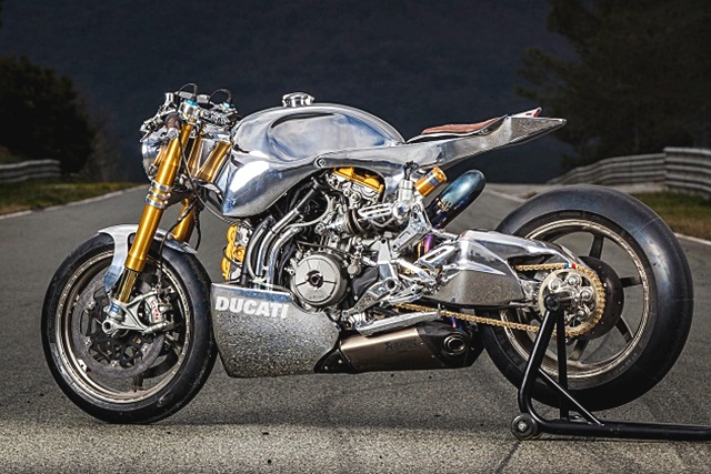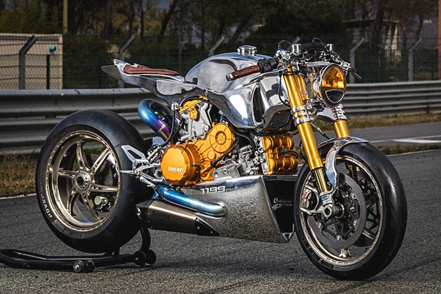 Ducati 1199 S Panigale มาในสไตล์ Racer แบบตัวแข่งเน็กเก็ต สุดแสบตาด้วยโทนสีทองอร่าม ทิ้งคราบ Superbike หมดเปลือก โดยสำนัก Ortolani Customsด้วยพื้นฐานจากดูคาติ พานิกาเล่ 1199 ซูเปอร์ไบค์ทรงพลังแบบสปอร์ต ถูกถอดแฟริ่งริ่งออก สร้างถังน้ำมัน เบาะนั่ง ไฟหน้า รวมถึงแฟริ่งใต้ท้องใหม่หมด จนไม่เหลือความสปอร์ต และกลับดูดุดันและโหดกว่าเดิมไปโดยปริยาย