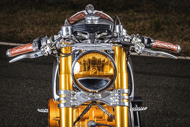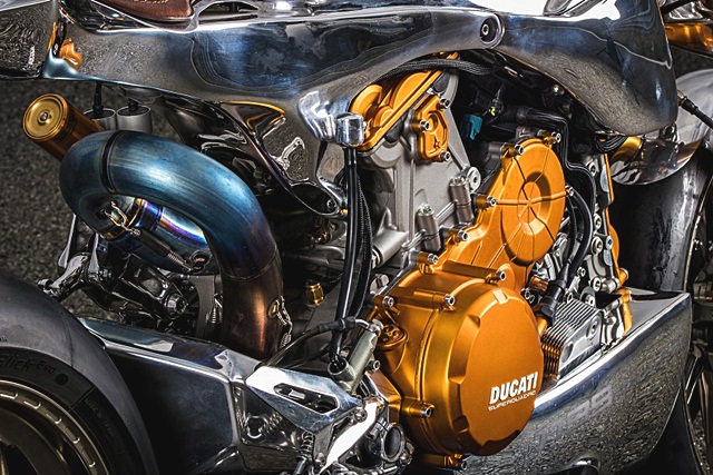 Ortolani Customs นำชิ้นส่วนทั้งเครื่องยนต์ แกนโช้กหน้า และไฟหน้าให้เป็นสีทองสะดุดตา ผสานความเงางามของถังน้ำมันอลูมิเนียม มาพร้อมเครื่องยนต์ L-Twin , 4 วาล์ว/สูบ ระบบขับวาล์วแบบ Desmodromic 205 แรงม้า และท่อไอเสียแบบไทเทเนียมบวกกับปลายท่อจากสำนักดัง Akrapovic
