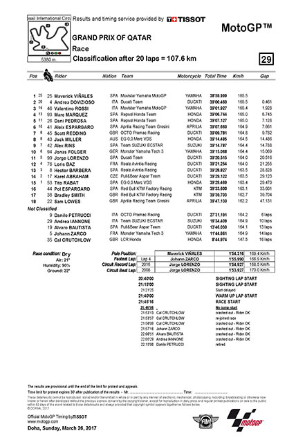 5 เม.ย. 60 6,599มาเวอริค บีญาเลส พายามาฮ่าประเดิมแชมป์ กาตาร์ กรังด์ปรีซ์ ศึก MotoGP 2017