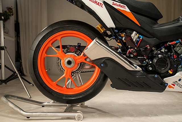 เริ่มจากการนำล้อของ Ducati รุ่น Panigale 1199 แต่งานแปลงใส่ก็ไม่ใช่เรื่องง่าย เพราะต้องใช้พาร์ตของ Honda รุ่น NSR150 SP เข้ามาช่วย เมื่อติดตั้งได้แล้วก็รัดด้วยยางสลิคจาก Pirelli รุ่น Diablo ช่วยให้ RS150R ดูเหมือนจอมทัพอย่าง RC213V-S ขึ้นมาบ้าง