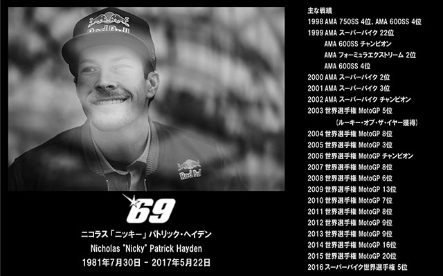 Honda Japan จัดนิทรรศการรำลึกถึง อดีตแชมป์โลก MotoGP "นิคกี้ เฮย์เดน" นักบิดชาวอเมริกัน ที่เสียชีวิตในวัย 35 ปี หลังจากที่ประสบอุบัติเหตุโดนรถยนต์ชนขณะกำลังขี่จักรยานออกกำลังกายที่ประเทศอิตาลี เมื่อวันที่ 22 พฤษภาคมที่ผ่านมา