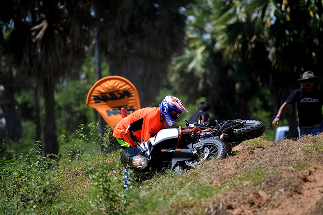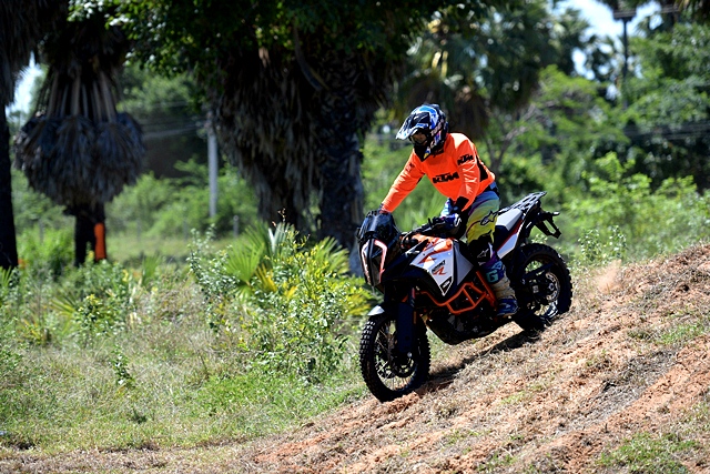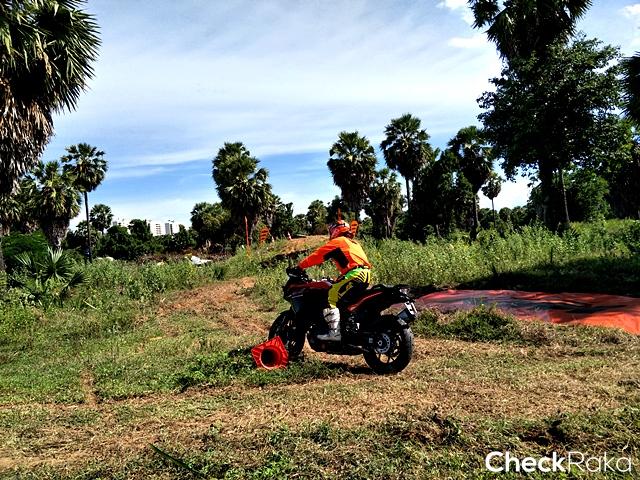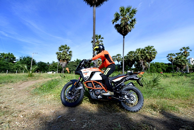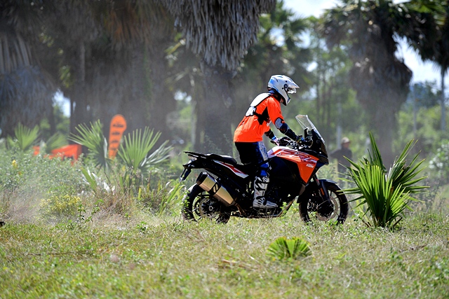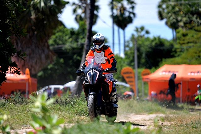 หลังจากงานเปิดตัวผู้เขียนได้มีโอกาสทดลองขี่ในคอร์สจำลองแบบเอนดูโร่ โดยมีรถเตรียมไว้ให้ทั้งหมด 4 รุ่น ผู้เขียนได้ขี่รุ่น KTM 1290 SUPER ADVENTURE S ซึ่งเป็นรุ่นเน้นทางเรียบ ประเภทของยางไม่เหมาะกับใช้วิ่งทางออฟโรดเท่าไหร่ ขณะที่เพื่อนสื่อมวลชนท่านอื่นได้รุ่น R แล้วแต่รอบ อย่างไรก็ตามการขี่ในคอร์สที่ออกแบบไว้เพื่อเน้นการทรงตัวมากกว่าทำความเร็วและลุย ทำให้แทบไม่มีโอกาสลองอะไรกับตัวรถมากนัก เพราะต้องใช้เกียร์ 1 ตลอด ด้วยน้ำหนักรถ 217 กก. และผู้เขียนที่หนัก 81 กก. รวมเครื่องแต่งกายก็เกือบ 300 กก. การขี่บนทางดินและหญ้าด้วยความเร็วแบบ Walking Speed ดูจะไม่มีปัญหาอะไรมากนัก ผู้เขียนยืนขี่เกือบตลอด พบว่าตัวรถควบคุมไม่ยาก ถังน้ำมันและโครงที่ออกแบบไม่กว้างมากนักเมื่อเทียบกับคู่แข่งทำให้การยืนแล้วหนีบทำได้สะดวก เมื่อเจอพื้นดินและทรายที่ร่วนเพราะถูกเปิดหน้าไว้ ทำให้ต้องใช้พลังผสานกับระบบช่วยเหลือในการฝ่าออกไป แต่ด้วยยางที่ไม่เอื้ออำนวยทำให้การผ่านเป็นไปด้วยความยากลำบากพอสมควร ในรอบหลังผู้เขียนพยายามเปิดไลน์ใหม่ที่เป็นทางดิน-หญ้าที่แน่นกว่า ก็ไปได้ง่ายขึ้น อย่างไรก็ตามทั้งหมดเป็นการขี่แบบช่วงสั้นๆ แต่ใช้พลังและเวลามากพอสมควรเพราะคอร์สค่อนข้างยาก โดยเฉพาะกับรุ่น S ที่เน้นทางเรียบ คงต้องหาโอกาสทดสอบแบบถนนจริงในโอกาสต่อไป
