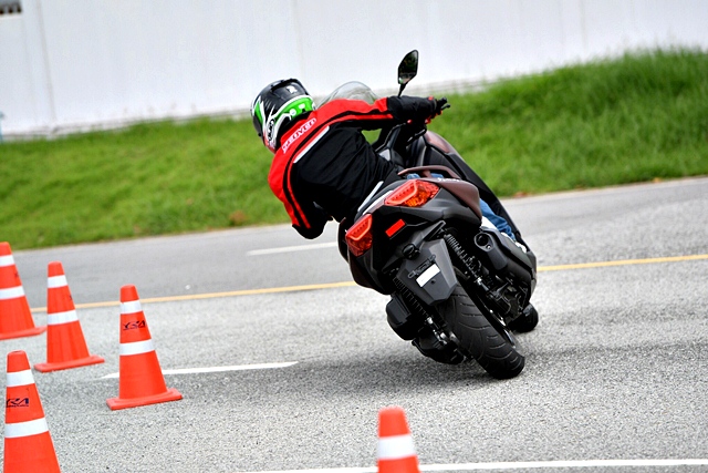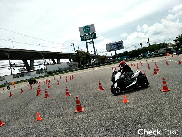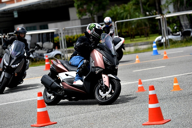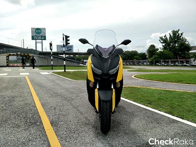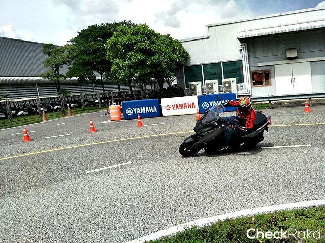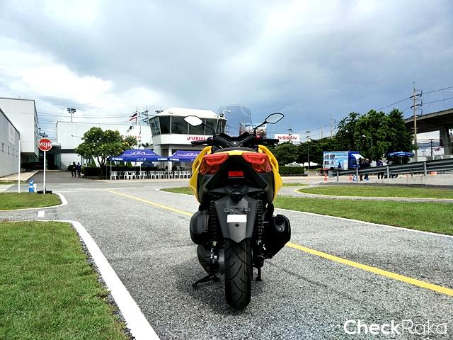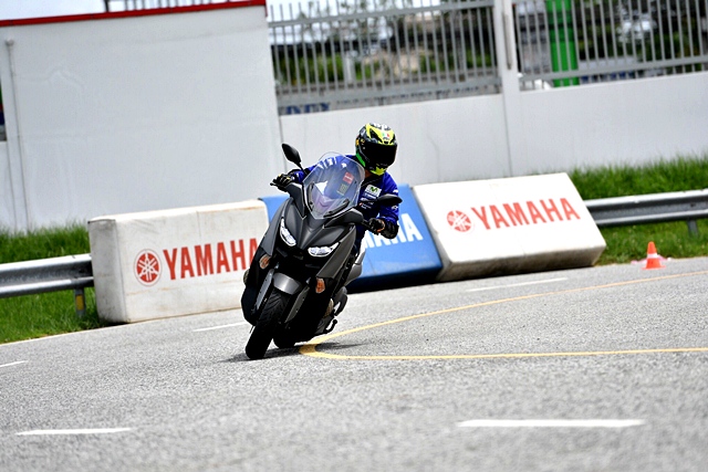 การทดลองขี่ทางผู้จัดได้แบ่งออกเป็นกลุ่ม กลุ่มละ 4 คน ตามจำนวน XMAX 300 ที่เตรียมไว้ทั้งหมด 4 คัน โดยให้วิ่ง 4 รอบสนาม ลักษณะของสนามและการจัดวางเน้นไปที่การทำความเร็วตอนออกตัว, การทรงตัว, การเข้าโค้ง, เบรก และความคล่องตัว ซึ่งผู้เขียนได้ลองขี่ 2 ช่วง รวมทั้งหมด 8 รอบ มากพอจนคุ้นเคยกับมิติของตัวรถ ทำให้ขี่ได้เต็มที่ในช่วงรอบหลังๆ จึงพอสรุปเบื้องต้นได้ว่า XMAX 300 เป็นรถที่มีอัตราเร่งและกำลังดีเมื่อเทียบกับน้ำหนักที่รวมผู้ขี่แล้วไม่ต่ำกว่า 250 กก., คล่องตัวในการเลาะเลี้ยวโค้งแคบ, ทรงตัวดีทั้งทางตรงและโค้ง แต่ระบบเบรกอาจต้องให้เวลาในการรันอินมากกว่านี้ เพราะเมื่อต้องการเบรกแบบหยุดสนิท การตอบสนองและพลังการจับยังแข็งทื่อไปบ้าง แต่โดยรวมแล้วเป็นรถที่ขนาดกำลังดีทั้งใช้งานในชีวิตประจำวันและขี่ท่องเที่ยว