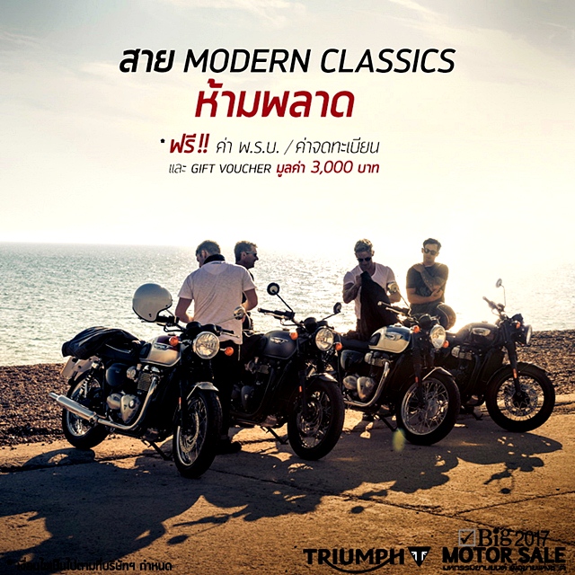 ไทรอัมพ์ มอเตอร์ไซเคิลส์ (Triumph) ส่งโปรโมชั่นแรงจัดเต็มเอาใจสาวกในงาน บิ๊ก มอเตอร์ เซลส์ 2017 (BIG Motor Sale 2017) สุดพิเศษ สำหรับตระกูลคลาสสิกทุกรุ่น ! ได้แก่ Bonneville Bobber, Street Scrambler, Bonneville T120, Bonneville T120 Black, Bonneville T100, Bonneville T100 Black, Thruxton R และ Street Twin ที่ซื้อภายในงานรับฟรีทันที Gift Voucher มูลค่า 3,000 บาท ค่าพ.ร.บ. และค่าจดทะเบียน
