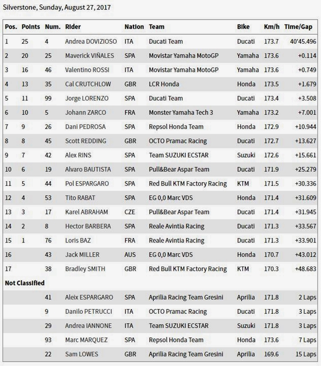 ได้ลุ้นกันสนุกสนานสำหรับ MotoGP 2017 สนามที่ 12 ในรายการ Octo British Grand Prix ที่ Silverstone Circiut โดยเฉพาะอย่างยิ่งสำหรับคะแนนสะสมที่ไม่ทิ้งห่างกันมากนักเมื่อนักบิดในกลุ่มหัวแถวมีการเปลี่ยนอันดับพร้อมที่จะเบียดแซงลุ้นตำแหน่งแชมป์โลกกันได้แบบสนุก ไม่นำขาดจนน่าเบื่อ