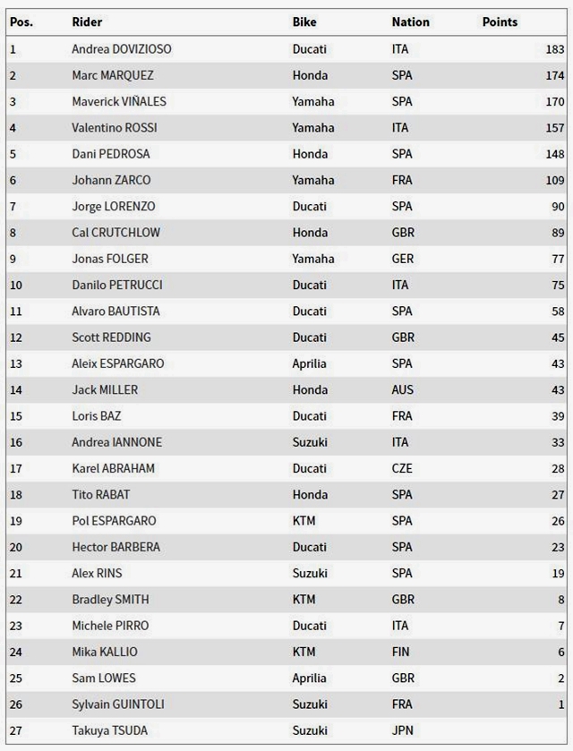รายการ Octo British Grand Prix ที่ Silverstone Circiut อันดับคะแนนสะสมประจำปี MotoGP 2017 สำหรับการแข่งขัน MotoGP สนามที่ 13 รายการ Gran Premio Tribul Mastercard di San Marino e della Riviera di Rimini ที่ อิตาลี ในวันที่ 10 กันยายน นี้ ใครจะเป็นผู้ชนะ ตำแหน่งผู้นำคะแนนสะสมจะเปลี่ยนไปอย่างไร คงต้องติดตามกันแบบห้ามละสายตาเลยทีเดียว