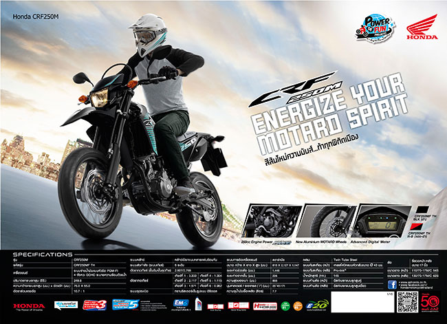 New Honda CRF250M รถโมตาร์ดยอดฮิตที่มาพร้อมกราฟิกใหม่แบบจีโอเมทริคแพทเทิร์น (Geometric Pattern) ภายใต้คอนเซปต์ Energize Your Motard Spirit เทรนด์ใหม่โดนใจคนเมือง ราคาแนะนำ 140,600 บาท วางจำหน่ายพร้อมกันทั้ง 2 รุ่นทั่วประเทศ ตั้งแต่วันที่ 21 มกราคมนี้