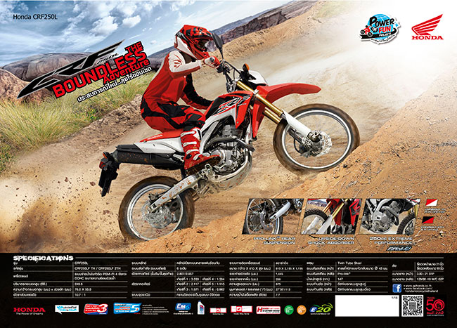 New Honda CRF250L รถสไตล์เอ็นดูโร่ที่รองรับทั้ง On-Road และ Off Road กับกราฟิกใหม่ภายใต้คอนเซปต์ The Boundless Adventure ถ่ายทอดความเป็นสปอร์ตจากสนามแข่งทางฝุ่นระดับโลกได้อย่างโฉบเฉี่ยว ราคาแนะนำ 134,600 บาท