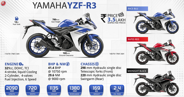 ยามาฮ่า วายแซดเอฟ-อาร์3 บิ๊กไบค์ขนาดกลางที่ออกมาอุดช่องว่างระหว่างรถ 250-500 ซีซี ที่มีความประหยัดพร้อมความแรงและอัตราเร่งที่เร้าใจ คล่องตัวสะดวกในทุกเส้นทาง เฟรมหน้าออกแบบให้ลู่ลมลดแรงเสียดทาน พร้อมไฟหน้าคู่ เบาะขนาดบางและไฟท้ายทรงแหลม ล้อแม็กลายสปอร์ต
