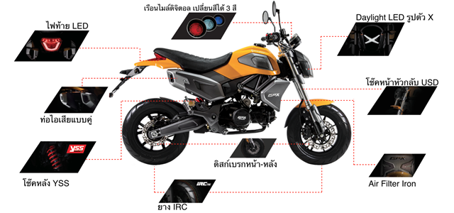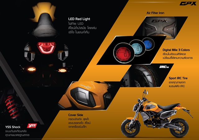 GPX รุ่น DEMON X 125 มินิไบค์สไตล์สปอร์ต ที่เป็นผลงานความร่วมมือระหว่าง GPX และทีมดีไซน์เนอร์ชาวอิตาลี จนออกมาเป็นเจ้าปีศาจ DEMON X 125 กับรูปร่างกะทัดรัด เหมาะกับไซส์ของคนไทย มาในพิกัด 125 ซีซี 4 จังหวะ กับออปชั่นที่ให้มาแบบคุ้มสุดคุ้ม โดดเด่นด้วยไฟหน้า Full LED รูปตัว X เอกลักษณ์เฉพาะตัว โช้กหน้าหัวกลับ Up Side Down โช้กหลังคุณภาพแบรนด์ดัง YSS สวยล้ำไปกับไฟท้าย LED ดีไซน์เก๋ และเรือนไมล์ดิจิตอล เปลี่ยนสีได้ถึง 3 สี ยางติดรถจากแบรนด์ IRC จัดดิสก์เบรกให้ทั้งหน้าและหลัง และที่เสริมความหล่อแบบสุดๆ คงจะต้องยกให้กับ ท่อคู่ ที่ติดมาให้จากโรงงานเลยทีเดียว ออกมาให้ในเลือกสรรกันถึง 4 สีพิเศษ คือ สีเหลือง(Yarkk Yellow), สีแดง (Red Velvet), สีเขียวทหาร (Green Soldier) และสีดำด้าน (Black Burn)