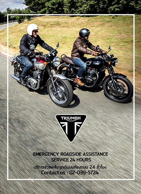 พิเศษ! ออกรถภายในเดือนนี้ รับบริการช่วยเหลือฉุกเฉินบนท้องถนนฟรี ตลอด 24 ชั่วโมง พร้อม Warranty ไม่จำกัดระยะทางเป็นเวลา 2 ปี โดยผู้สนใจสามารถสอบถามข้อมูลเพิ่มเติม รวมถึงทดลองขี่รถมอเตอร์ไซค์ไทรอัมพ์ทุกรุ่นได้ ณ โชว์รูมไทรอัมพ์ ทั้ง 11 สาขาทั่วประเทศ หรือติดตามข่าวสารและกิจกรรมอื่นๆ ได้ที่ www.facebook.com/TriumphMotorcyclesThailand