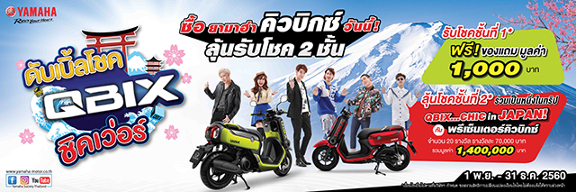 ยามาฮ่าจัดหนักดับเบิ้ลโชคให้กับลูกค้าคิวบิกซ์ รับของขวัญทุกคัน! และลุ้นบินไปญี่ปุ่นกับพรีเซ็นเตอร์สุดฮ็อต!บริษัท ไทยยามาฮ่ามอเตอร์ จำกัด จัดโปรโมชั่นสุดอลังการ กับแคมเปญ "ดับเบิ้ลโชค QBIX ชิคเว่อร์" เพียงลูกค้าที่ซื้อรถคิวบิกซ์ (Yamaha QBIX) ที่ยามาฮ่าสแควร์ทุกสาขา และร้านผู้จำหน่ายรถจักรยานยนต์ยามาฮ่าทั่วประเทศ รับโชคชั้นที่ 1 ทันที ของขวัญมูลค่า 1,000 บาท ทุกคัน พร้อมลุ้นโชคชั้นที่ 2 ร่วมทริปเที่ยวญี่ปุ่นแบบชิคๆ กับพรีเซ็นเตอร์ยามาฮ่าคิวบิกซ์ 6 วัน 3 คืน 20 รางวัลรวมมูลค่า 1,400,000 บาท พิเศษสำหรับลูกค้าที่ซื้อรถตั้งแต่วันที่ 1 พ.ย. - 31 ธ.ค. 2560 เท่านั้นพบกับ ยามาฮ่า คิวบิกซ์ (Yamaha QBIX) ออโตเมติกเจเนอเรชั่นใหม่สุดล้ำ สมาร์ททุกมิติ สไตล์ Digital automatic bike เทรนด์ใหม่แห่งดีไซน์แฟชั่นด้วยรูปทรงสี่เหลี่ยมโค้งมน วันนี้ที่ยามาฮ่าสแควร์ ทุกสาขาทั่วประเทศราคาแนะนำ- ยามาฮ่า คิวบิกซ์ (Yamaha QBIX) ราคา 53,500 บาท*