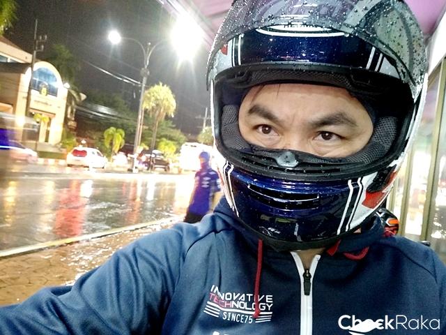 ขี่ลุยฝนกันมาสักพัก เครื่องยนต์ของ Aerox 155 ก็ยังตอบสนองการทำงานได้ดีอยู่ แม้ตัวผู้เขียนเริ่มเปียกชุ่มไปด้วยฝน จนถึงแยกที่มีน้ำรอระบายระดับสูง จนคิดว่าไม่น่าผ่านไปได้ แต่ก็ไม่สามารถหยุดได้เช่นกันเพราะฝนกระหน่ำอยู่ตลอด ทำให้ต้องเลือกเลนที่มีระดับน้ำต่ำที่สุดเพื่อผ่านไป น้ำท่วมอยู่ในระดับครึ่งล้อ แต่ด้วยสมรรถนะของเครื่องยนต์ผสานกับการทำงานกับเกียร์ CVT ช่วยผลักดันตัวถังให้ผ่านไปได้ด้วยดี และเดินทางจนถึงที่พักในสภาพเปียกปอนทั้งรถและคน