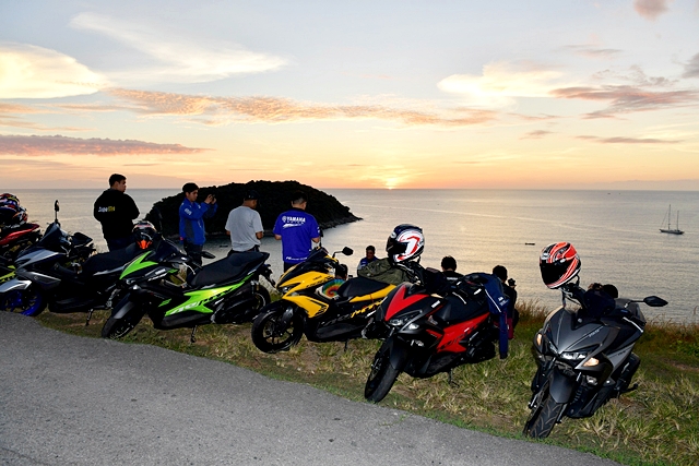 ผู้เขียนพร้อมกับเพื่อนสื่อมวลชนจำนวนหนึ่งเดินทางไปภูเก็ตพร้อมไปรับรถ Yamaha Aerox 155 สีใหม่ ที่ Yamaha Riders' club Phuket ซึ่งมีการเปิดตัวอย่างเป็นทางการในวันนั้น โดยมีเตรียมไว้ทั้งหมด 7 คัน ผู้เขียนได้รุ่นสแตนดาร์ดสีดำ-แดง การเดินทางเริ่มหลังจากจบการเปิดตัว ยามาฮ่า ไรเดอร์ส คลับ แห่งใหม่ที่ภูเก็ต ซึ่งเป็นช่วงเย็น โดยจุดหมายวันแรกของทริปเป็น จุดชมวิวกังหันลม หรือเรียกชื่อเต็มๆ ว่า "สถานีพลังงานทดแทน พรหมเทพ" เป็นสถานที่ตั้งของสถานีทดลองการผลิตไฟฟ้าจากกังหันลม ใช้ชื่อว่า สถานีพลังงานทดแทนพรหมเทพ โดยตั้งอยู่ทางทิศเหนือของแหลมพรหมเทพ ประมาณ 1 กิโลเมตร(กฟผ.) ซึ่งต้องขี่ขึ้นเขาชันพอสมควร แต่พลังจากเครื่องยนต์ขนาด 155 ซีซี พร้อมระบบวาล์วแปรผัน VVA ให้แรงบิดส่งตัวรถขึ้นทางลาดชันได้อย่างทันใจ