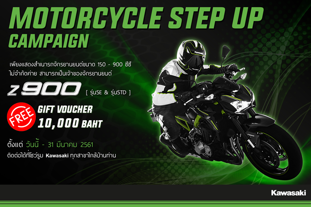 *Z900 โปรโมชั่น Motorcycle Step up สำหรับผู้ที่ครอบครองรถ 150-900cc. รุ่นใดก็ได้จะได้รับ Gift Voucher มูลค่า 10,000 บาท
