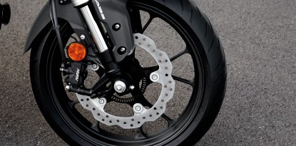 Upside-Down Front Suspension and Hubless Floating Disc ครั้งแรกของโช้กหน้าหัวกลับสีเงินขนาดใหญ่ 41 มม. ขนาดเดียวกับรถระดับบิ๊กไบค์ของฮอนด้า ช่วยเพิ่มการทรงตัวที่ดีเยี่ยมทุกสภาพถนน นอกจากนี้ยังมีดิสก์เบรกหน้าขนาด 296 มม. แบบจานแยกชิ้น เรเดียลเมาท์ 4 พอต คาลิปเปอร์ พร้อม ABS G-Sensor ระดับเดียวกับรถในสนามแข่ง มั่นใจในการเบรกทุกช่วงความเร็ว